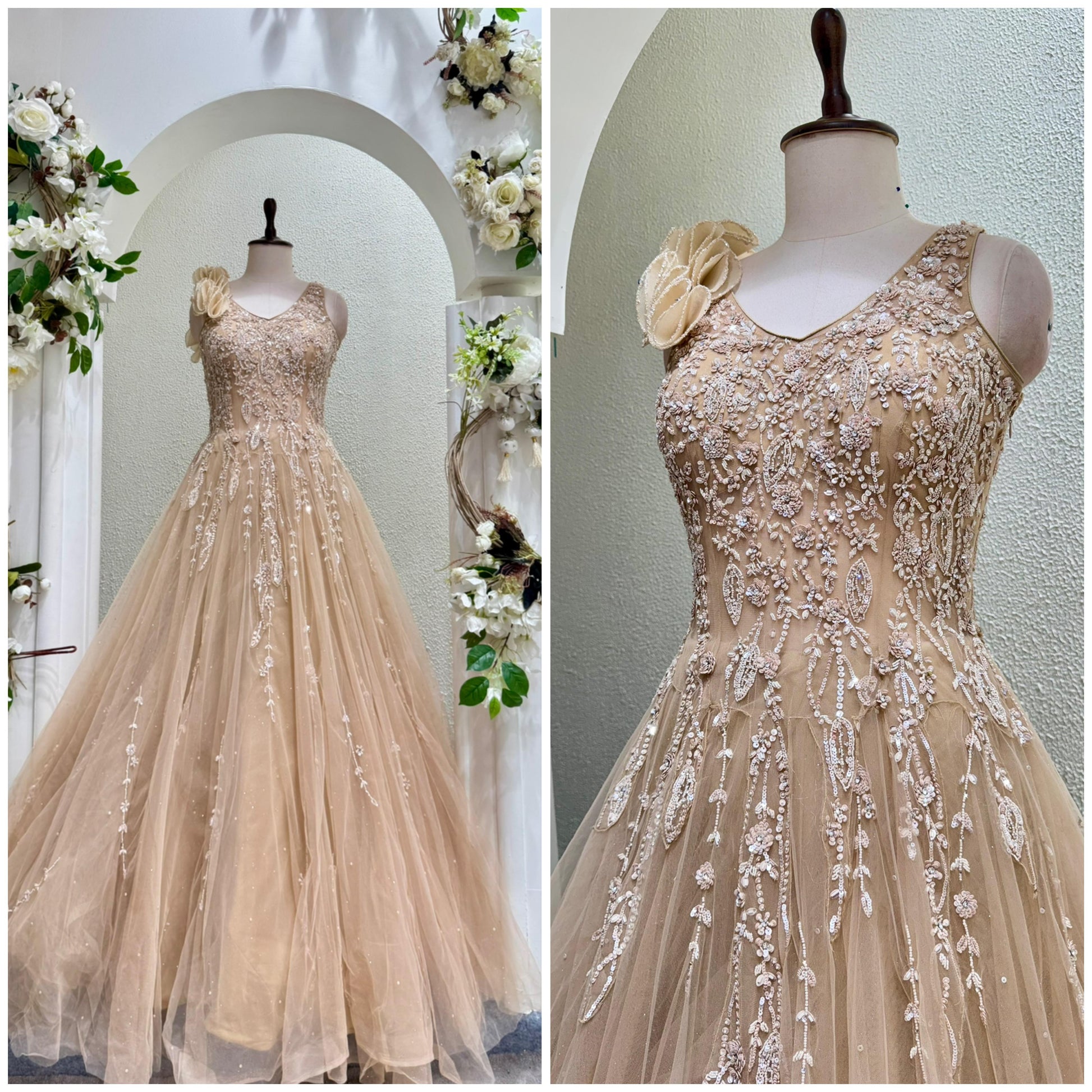 This elegant ball gown boasts handwork sheer fabric, adding intricate detail to the dress. Expertly crafted with a delicate touch, this gown exudes a timeless and luxurious feel. Perfect for any formal occasion, it is sure to make a lasting impression.