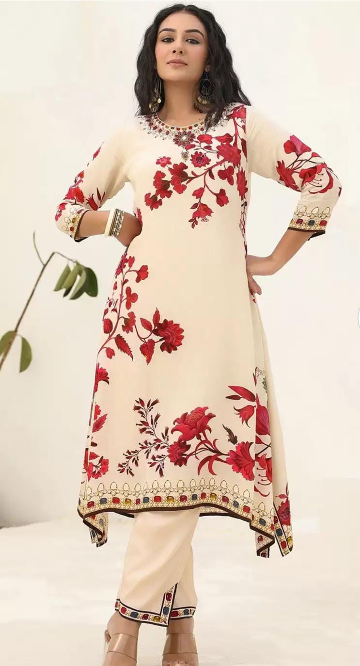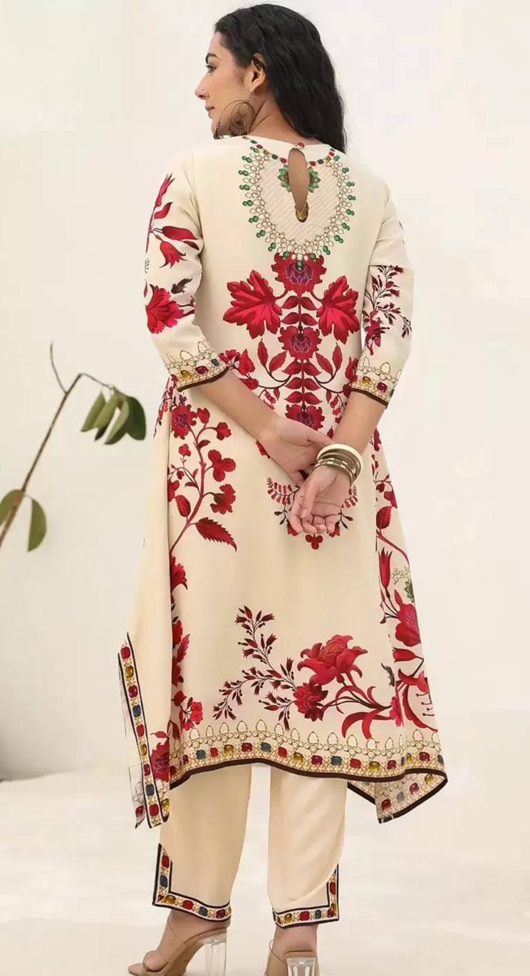 Crafted from pure crepe fabric, this piece features exquisite digital print detailing complemented by delicate handwork. The lightweight and breathable crepe ensures comfortable wear, while the intricate hand embellishments add a refined touch of artistry, elevating the garment's appeal with expert craftsmanship.