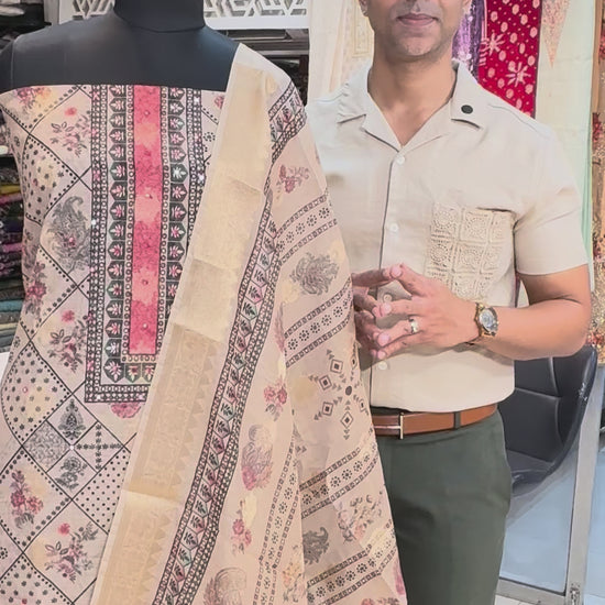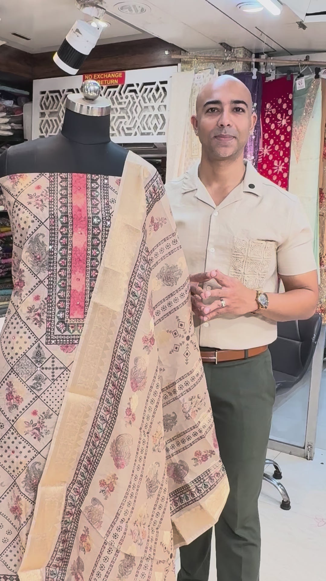 Experience the timeless elegance of Banarasi fabric meticulously crafted on pure Gadwal silk. This combination blends the rich, intricate weaving tradition of Banarasi with the smooth, durable texture of Gadwal silk, ensuring a luxurious feel and lasting quality. Ideal for special occasions, it offers a sophisticated drape and vibrant sheen, making each piece a statement of refined artistry and heritage.