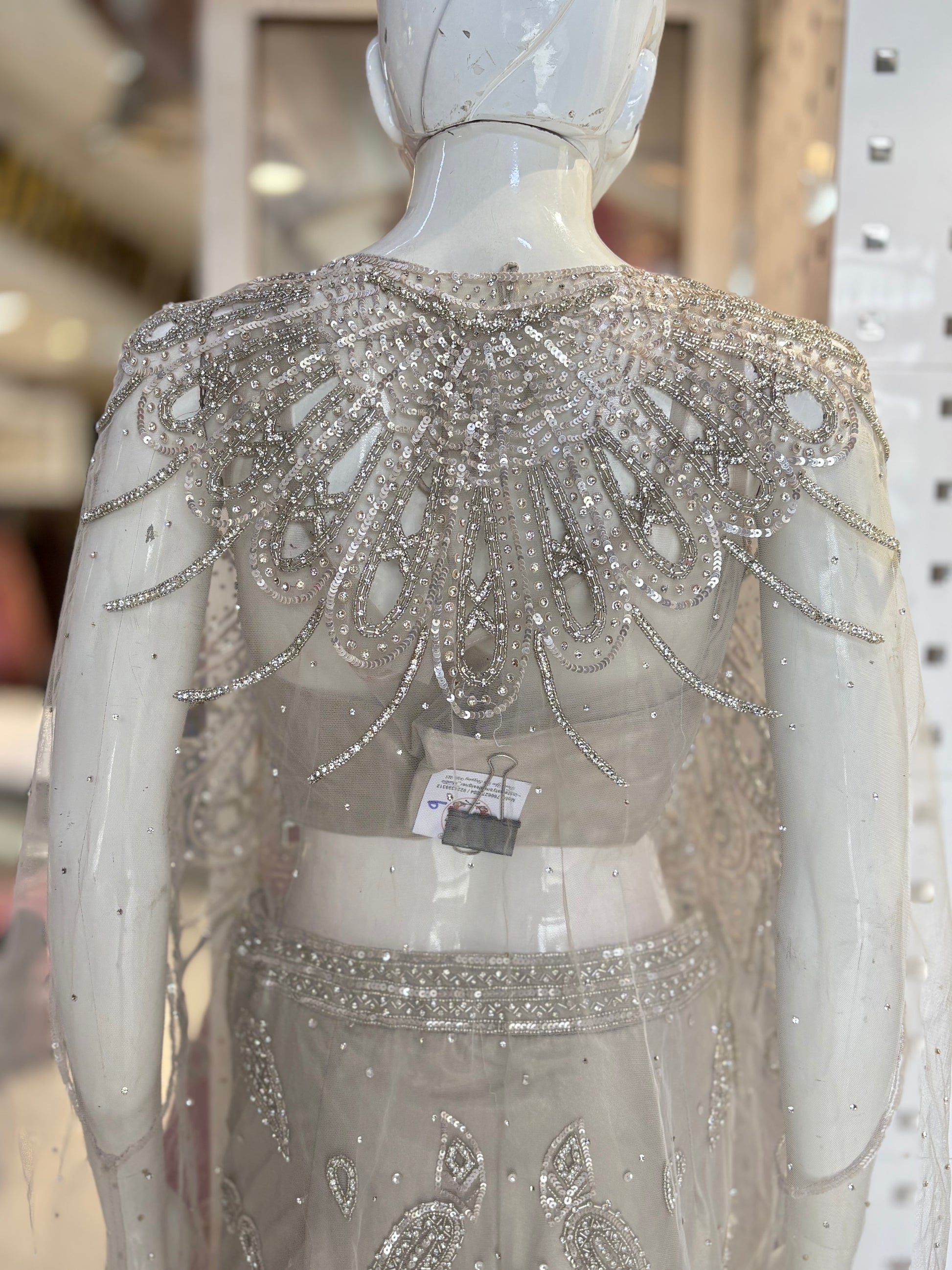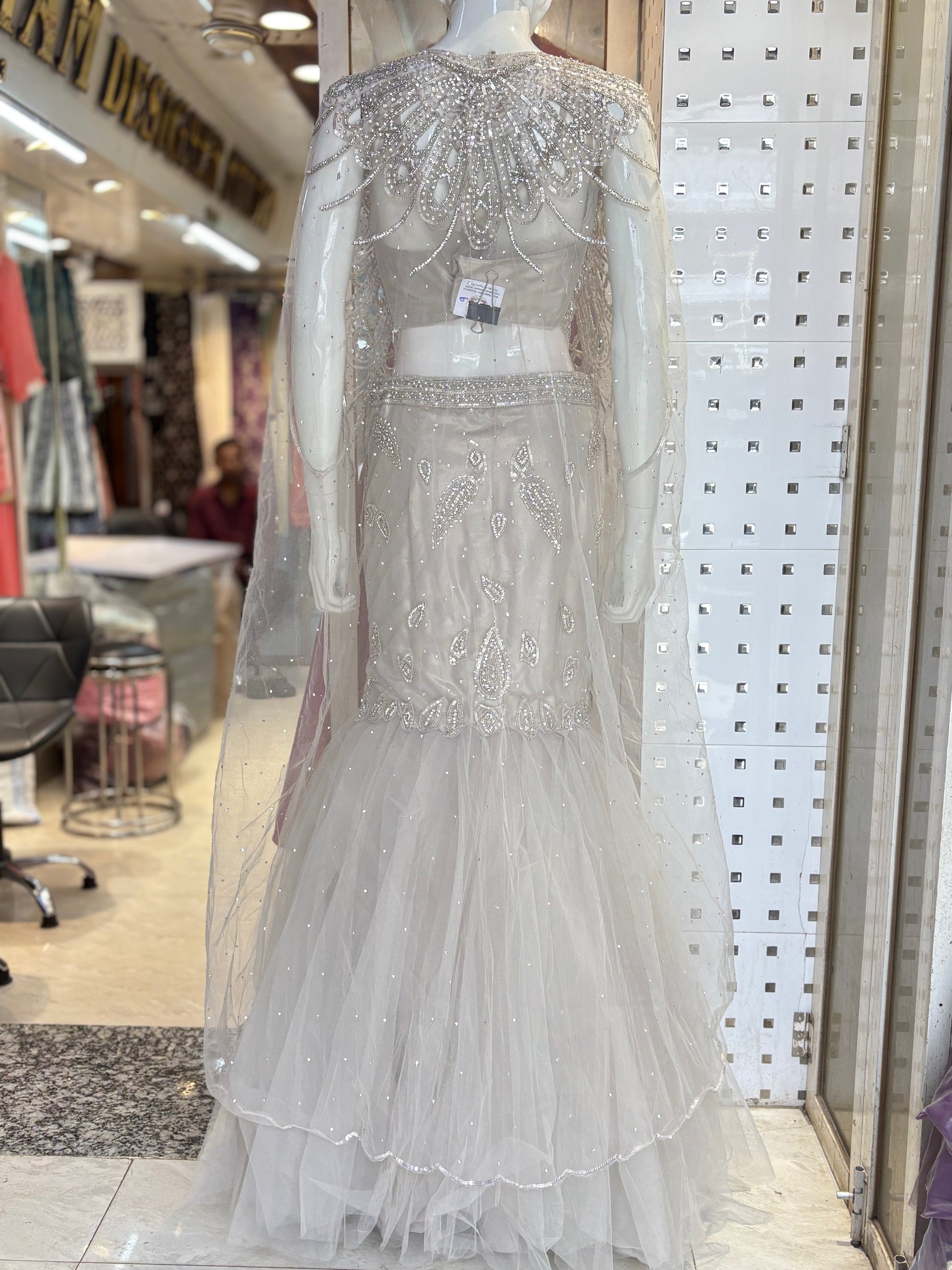 This Fishcut lehanga choli features a luxurious blend of pure organza and Maharani net fabrics, combining elegance with comfort. The expertly crafted designer cape adds a regal touch, enhancing the overall silhouette. Ideal for special occasions, this ensemble offers graceful movement and a sophisticated aesthetic, perfect for those seeking refined traditional attire with a contemporary edge.