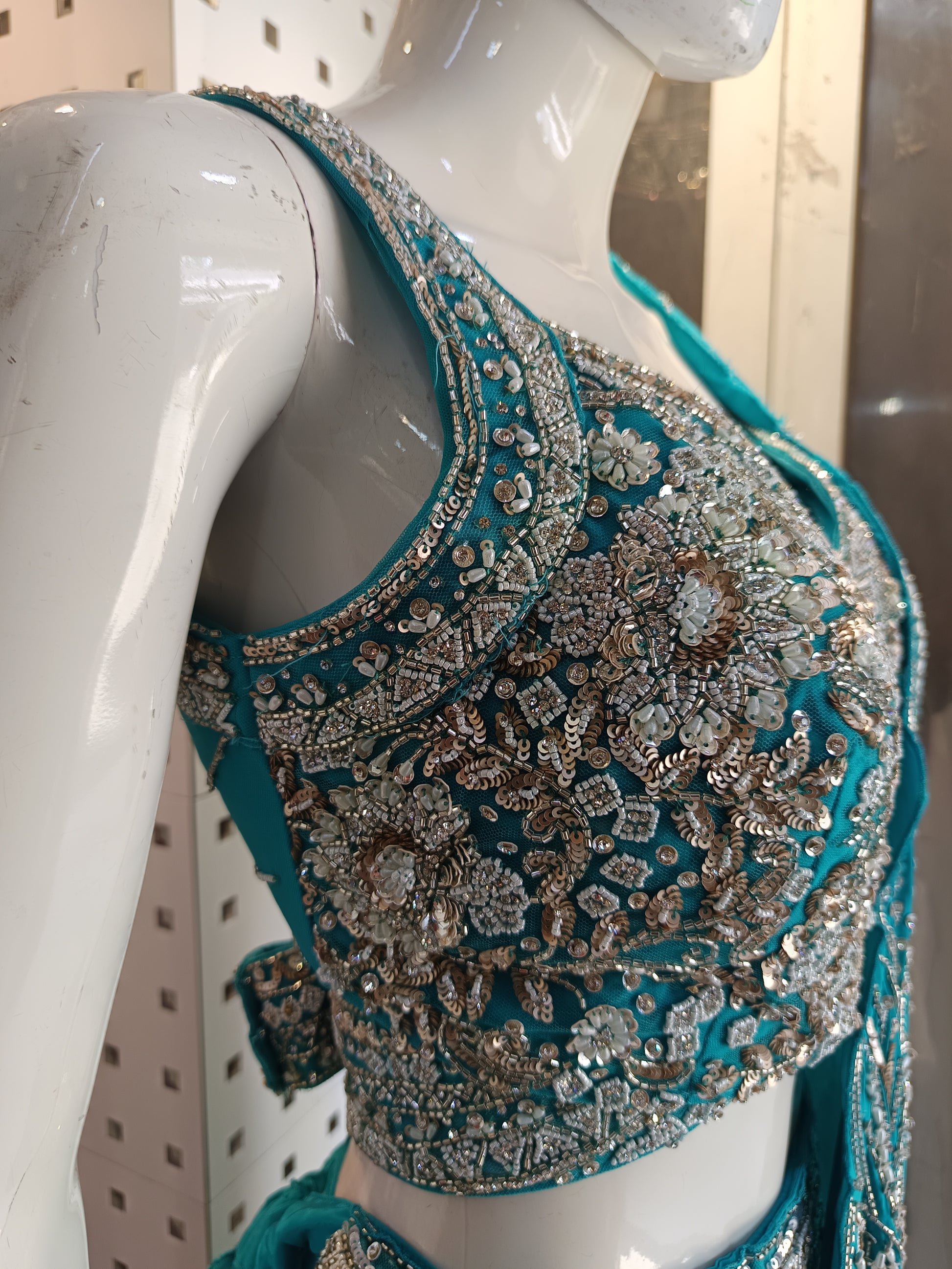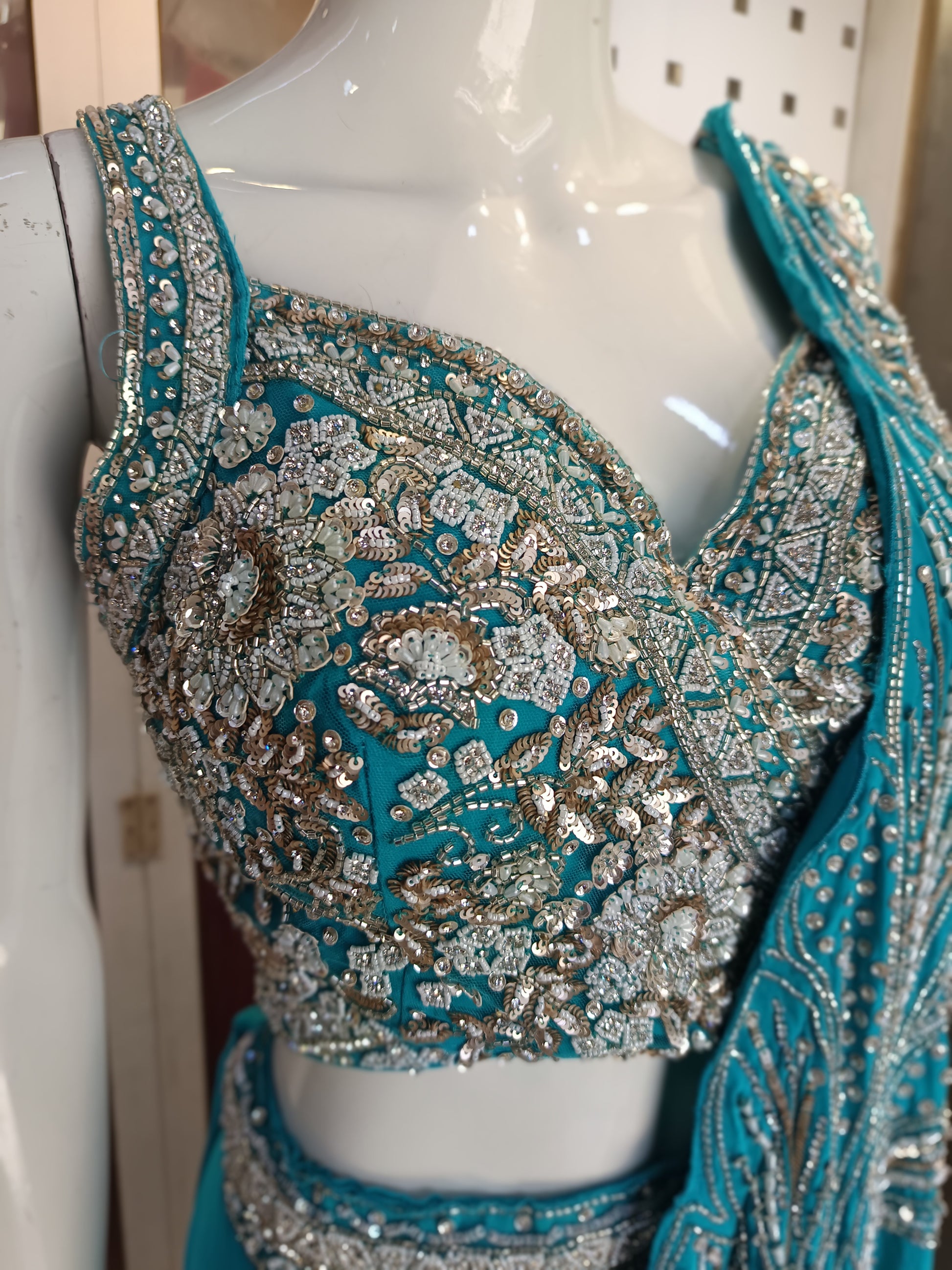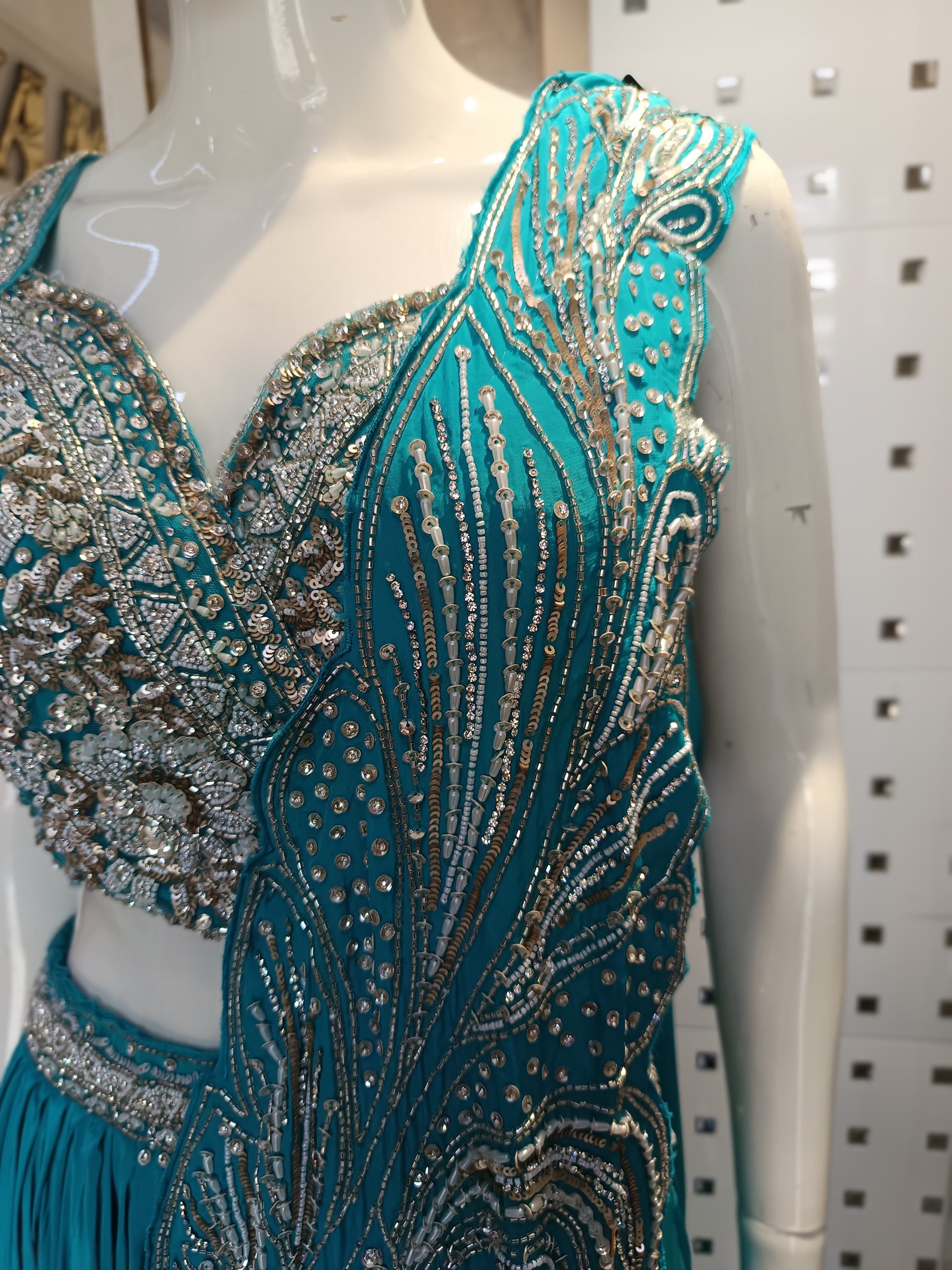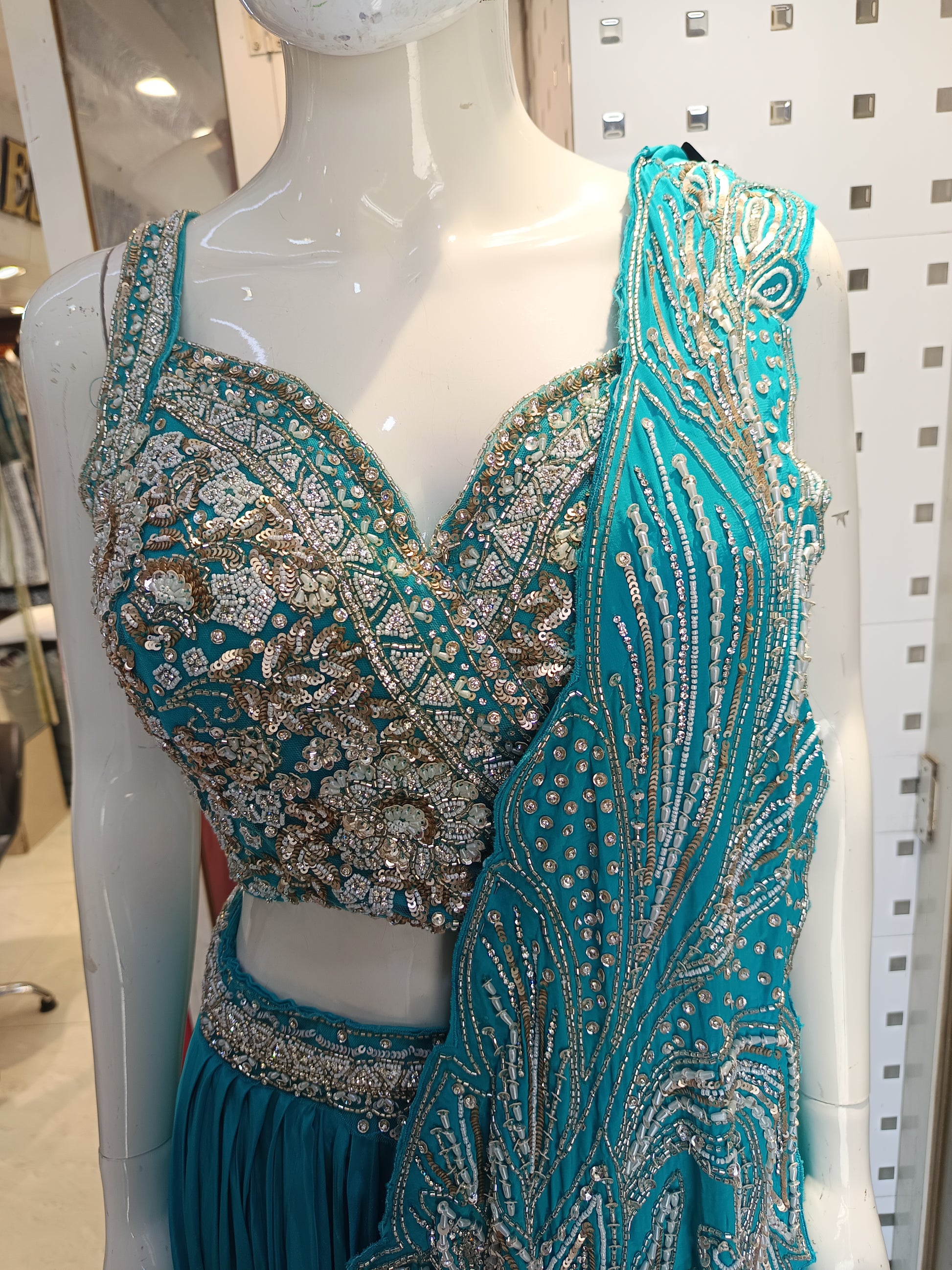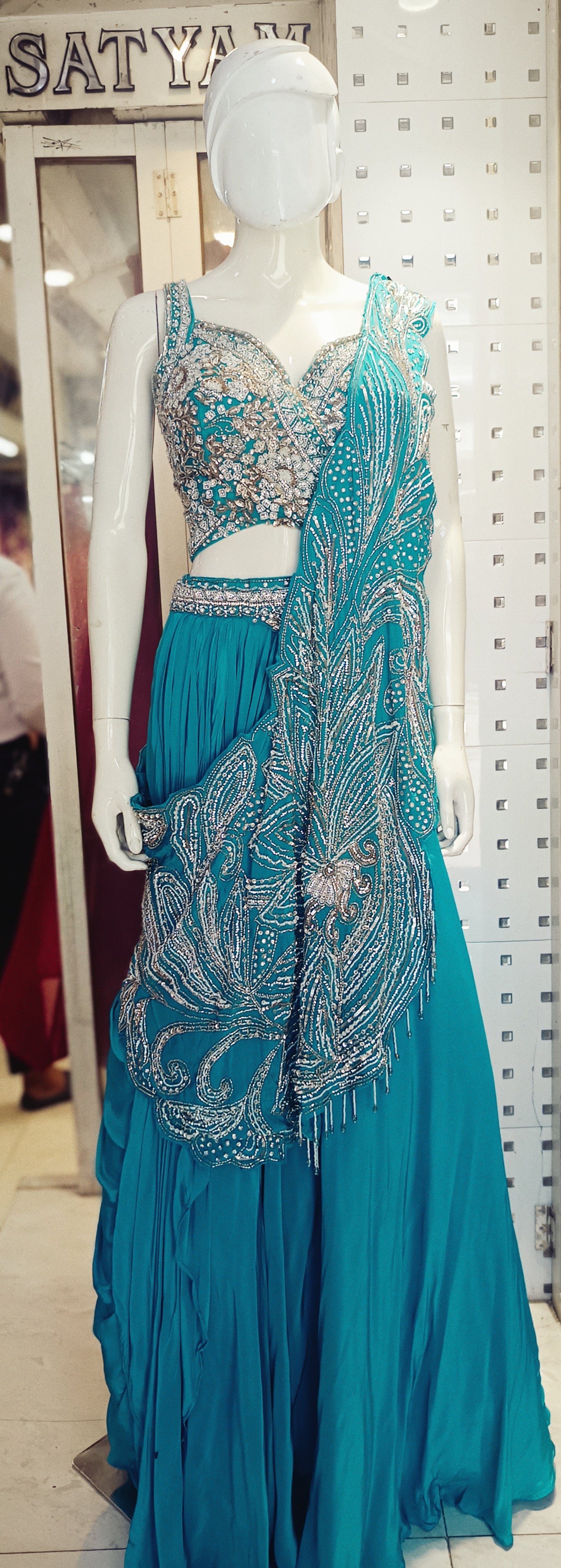 This lehanga features a sheer crepe fabric paired with an intricately hand-worked blouse and choli, combining traditional craftsmanship with elegant textile quality. The ensemble includes a draped palo that enhances its graceful silhouette, making it ideal for special occasions where refined style is desired. The breathable crepe ensures comfort while the detailed handwork adds a unique artisanal touch.