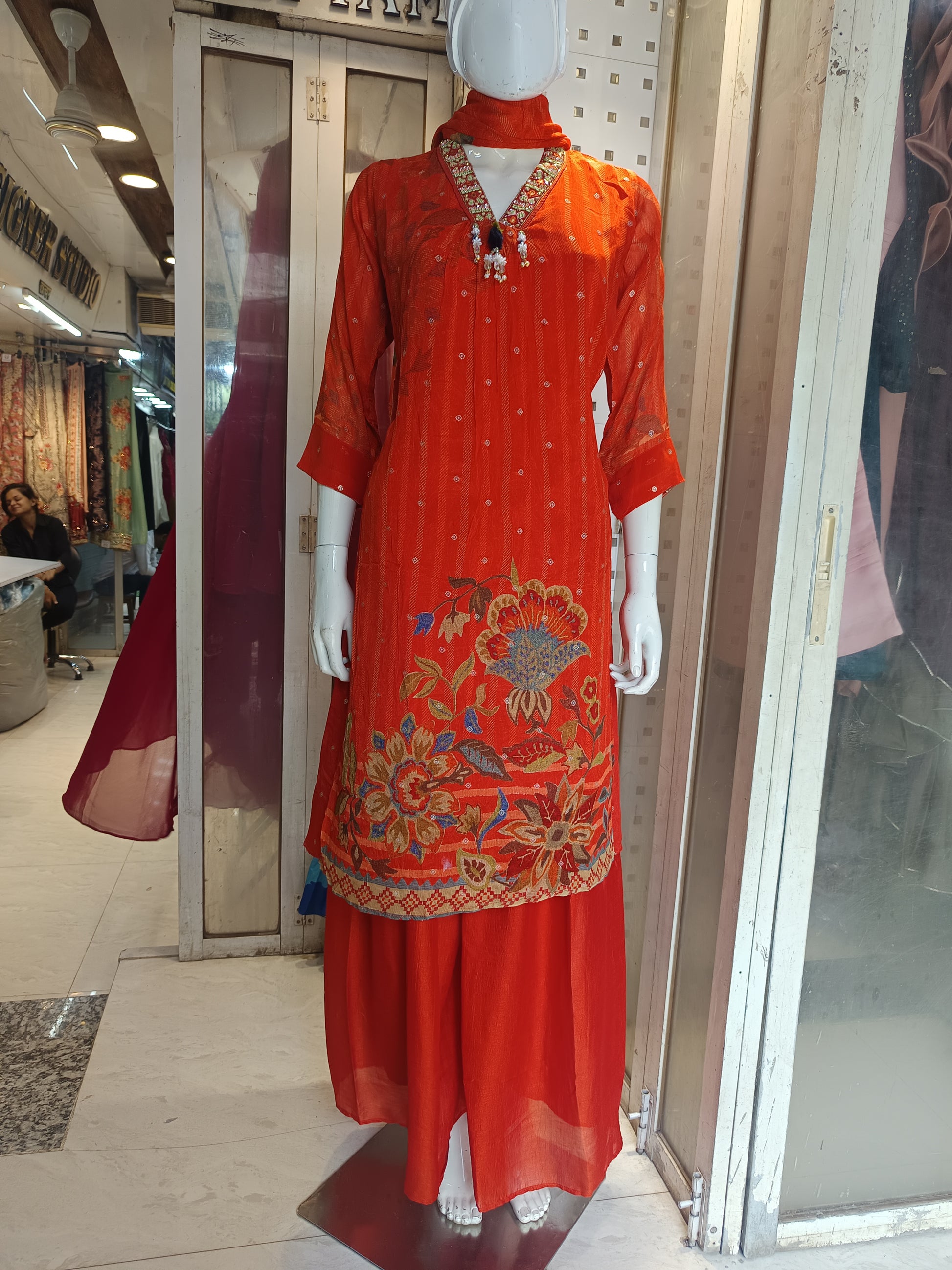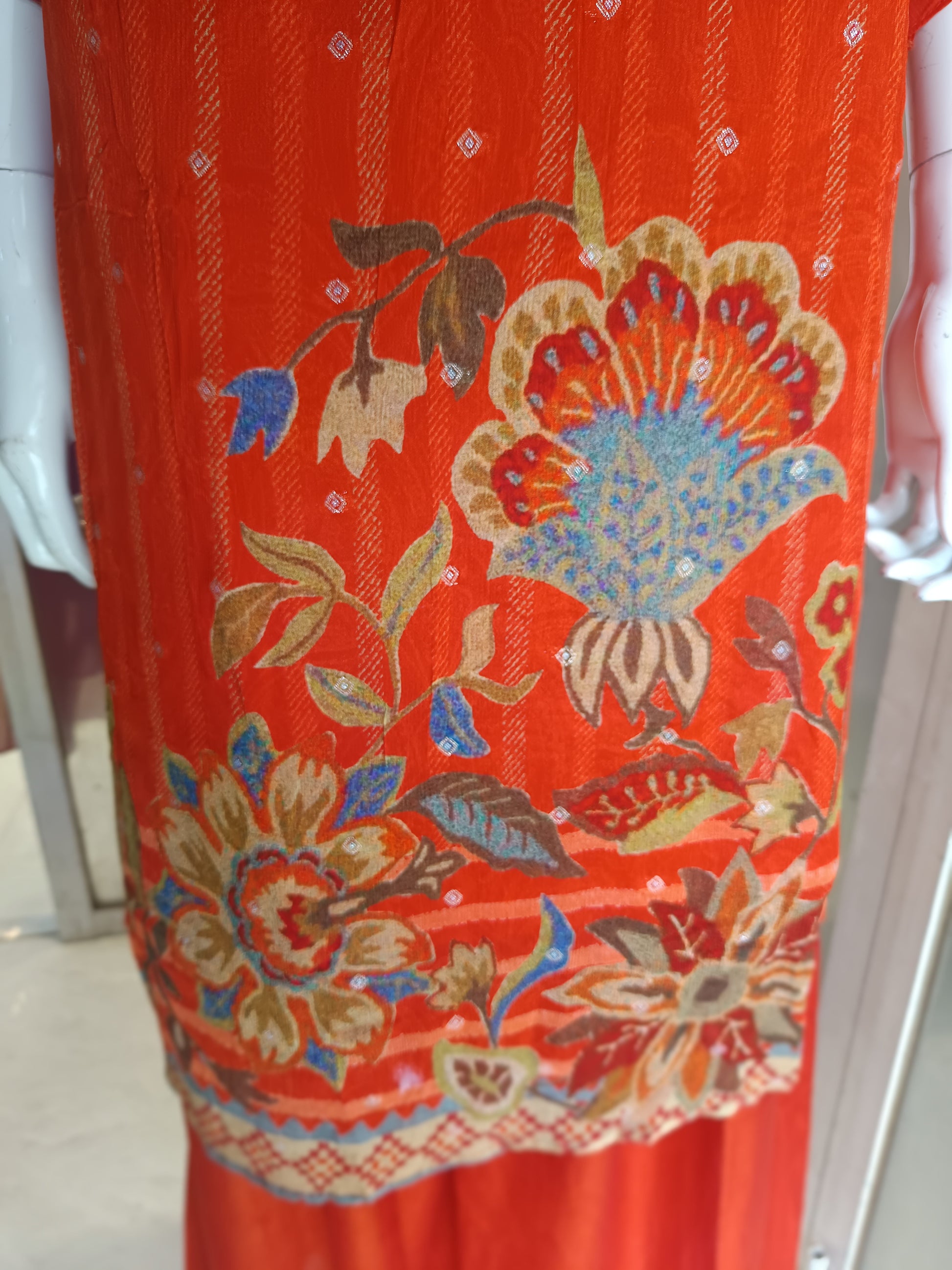 Experience elegance and comfort with this plazo paired with a kurti, crafted from pure crepe fabric featuring a vibrant digital print. The lightweight material ensures breathability and fluid movement, while the digital print adds a contemporary touch. Perfect for both casual and festive occasions, this ensemble combines traditional style with modern sophistication, offering a refined look without compromising on comfort.