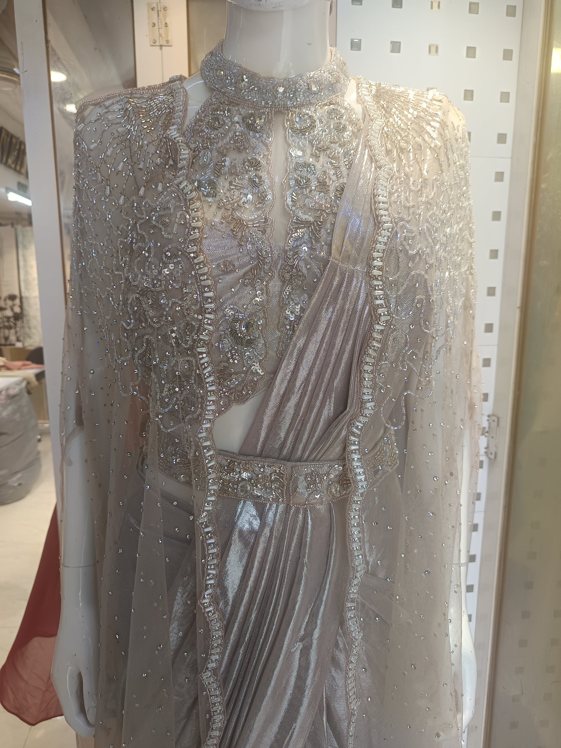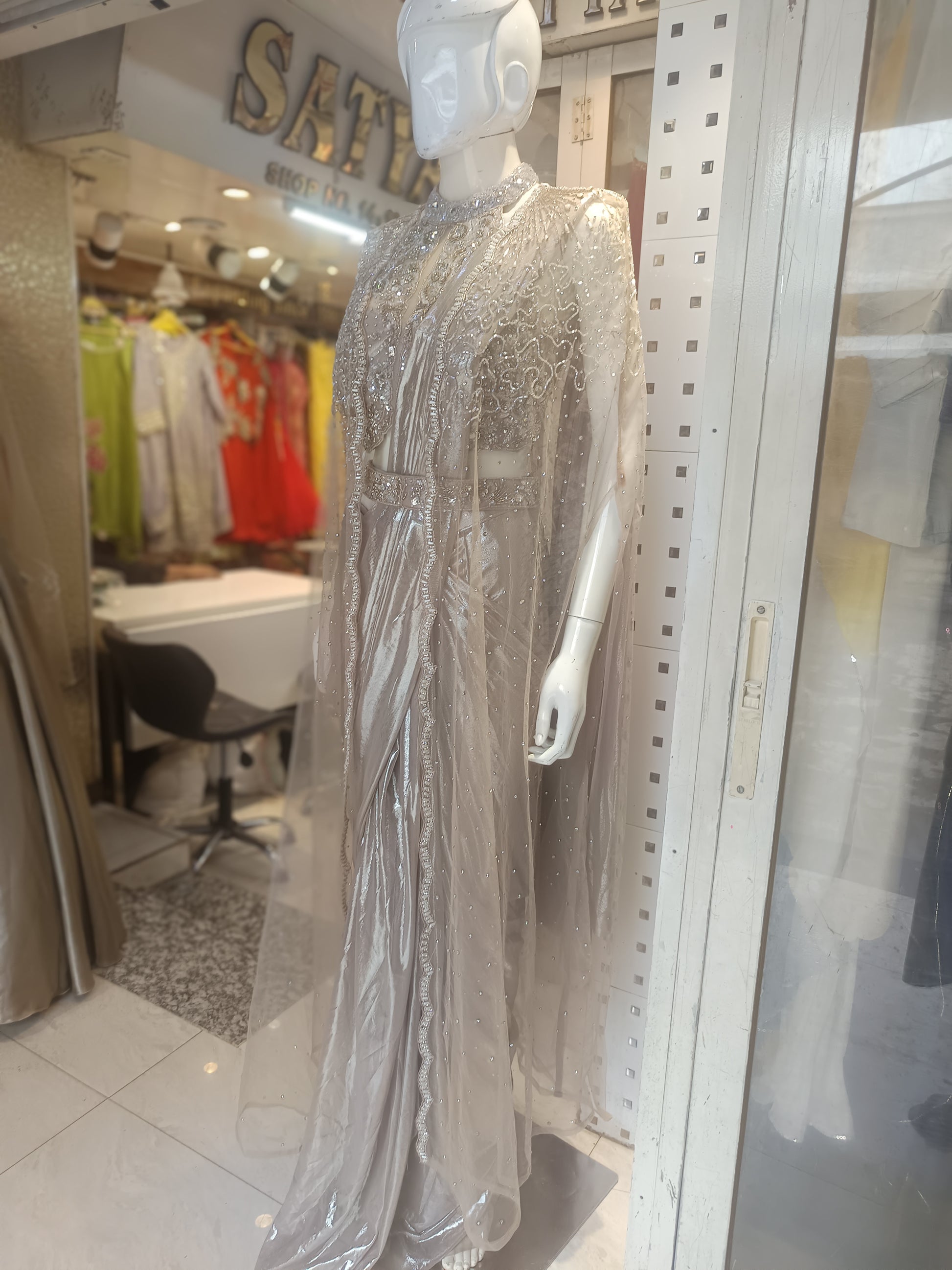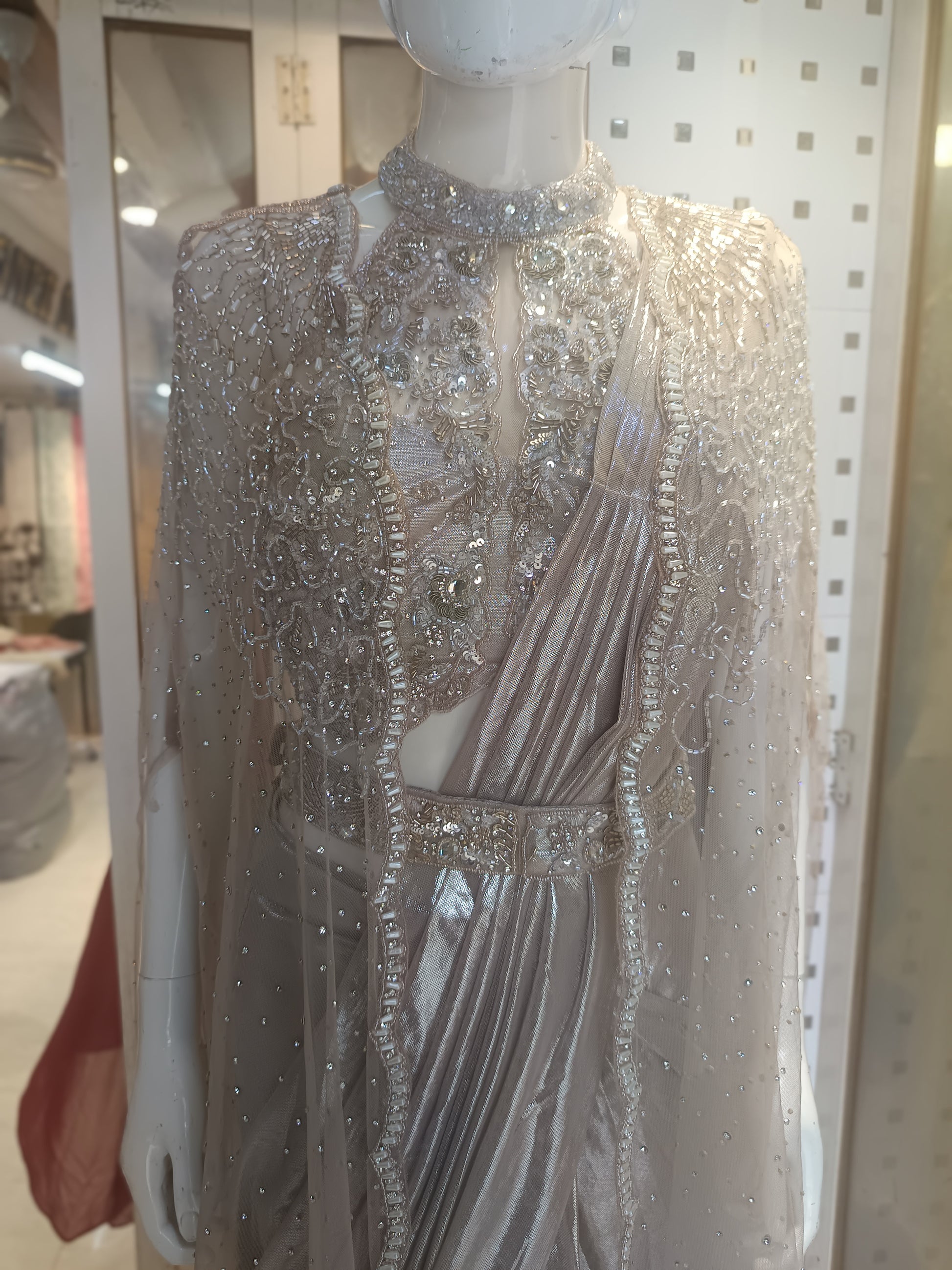 This ready-to-wear saree features elegant Maharani net fabric, perfectly complemented by intricate handwork on the blouse. Paired with a long jacket, it offers a sophisticated and contemporary silhouette, combining traditional craftsmanship with modern style for a refined look. Ideal for festive occasions and formal events, it ensures both comfort and grace.