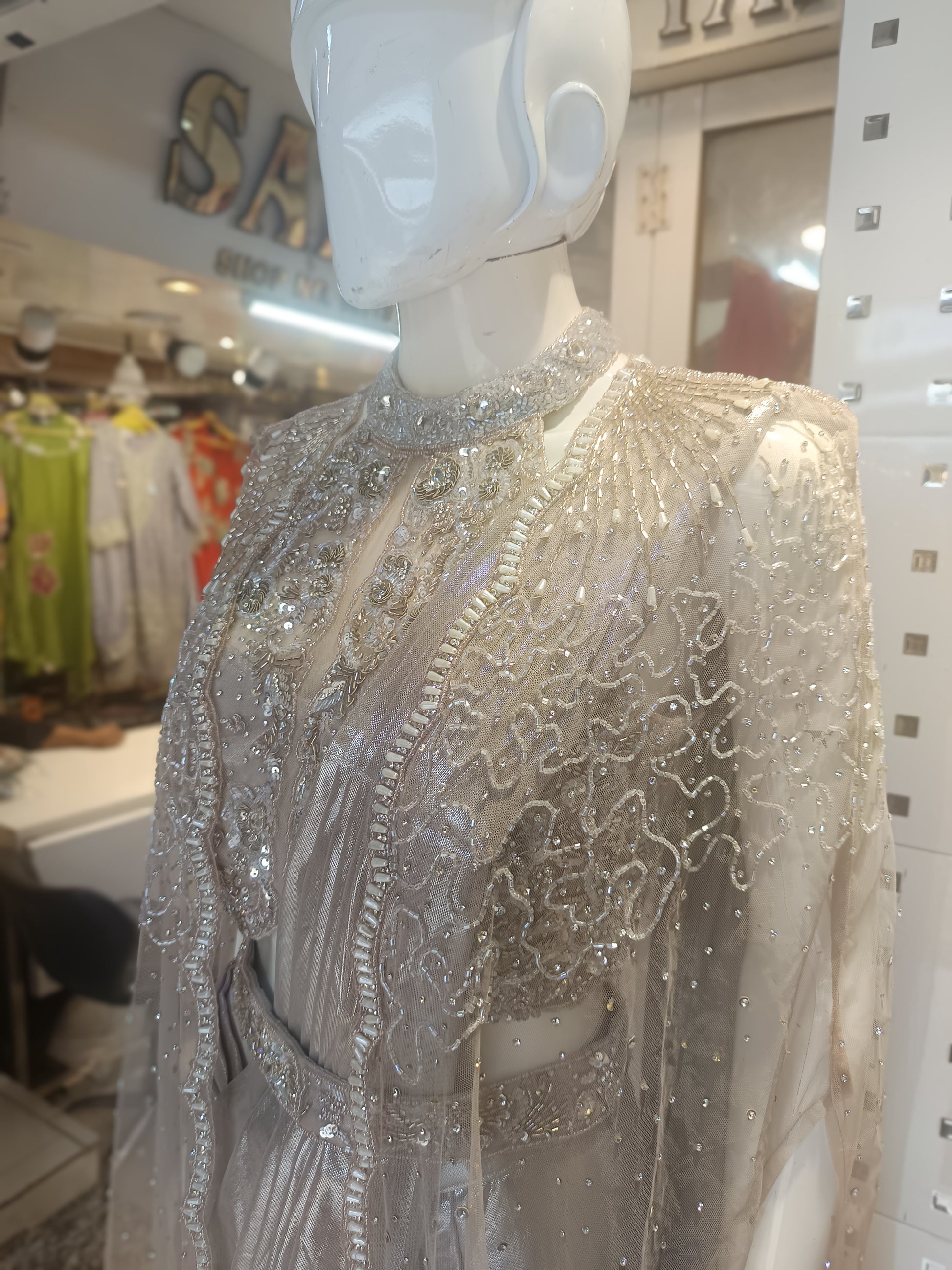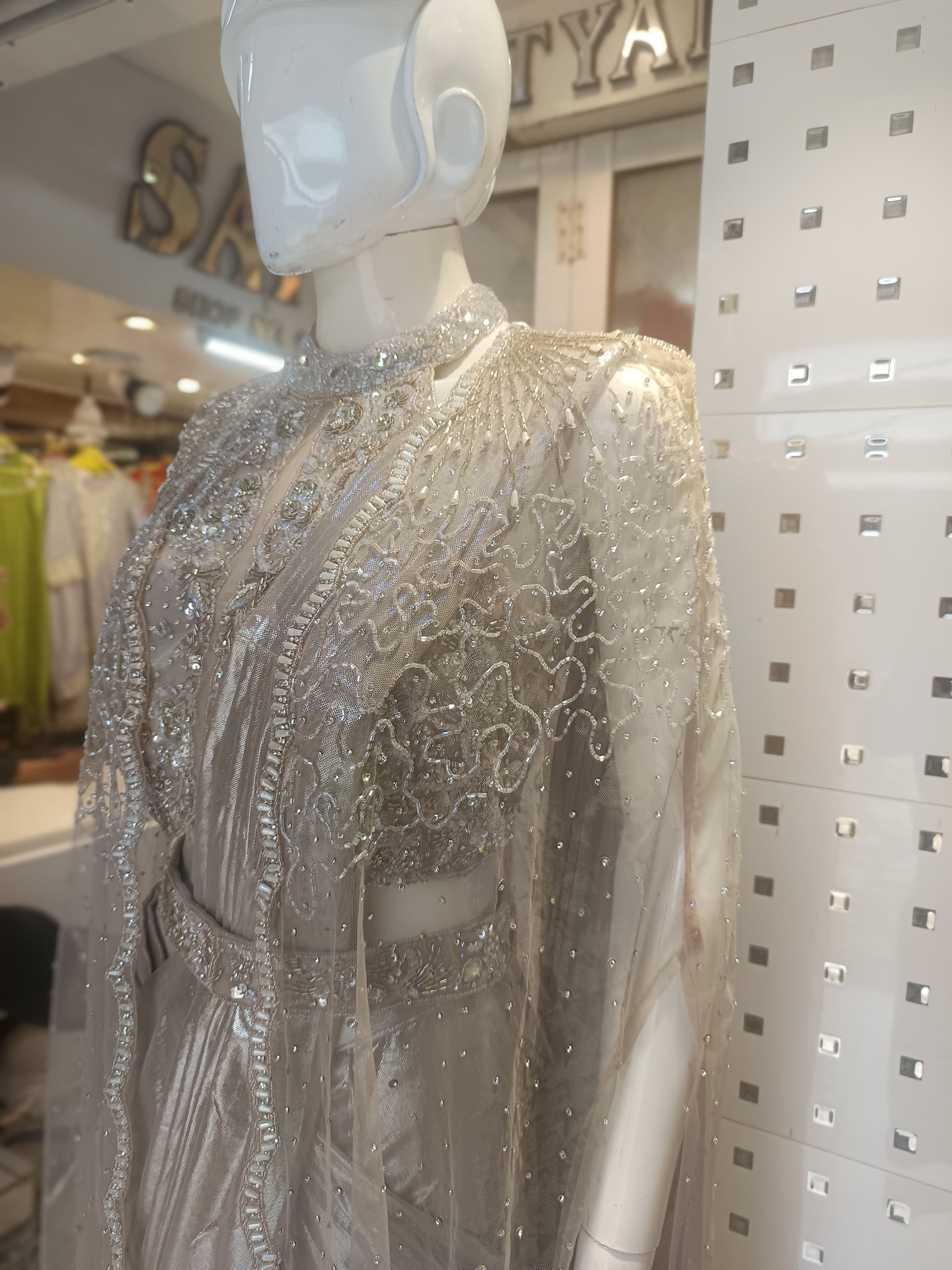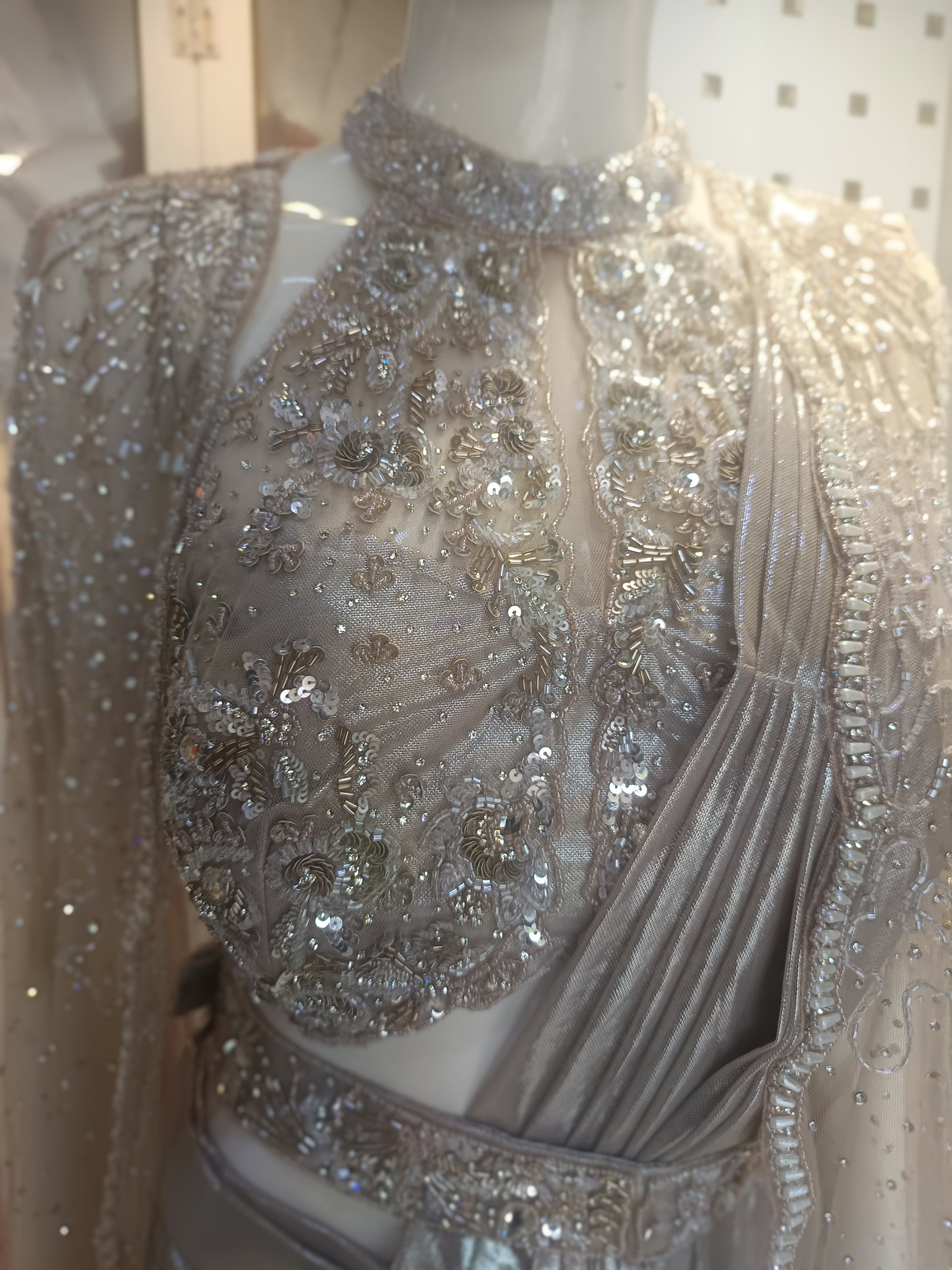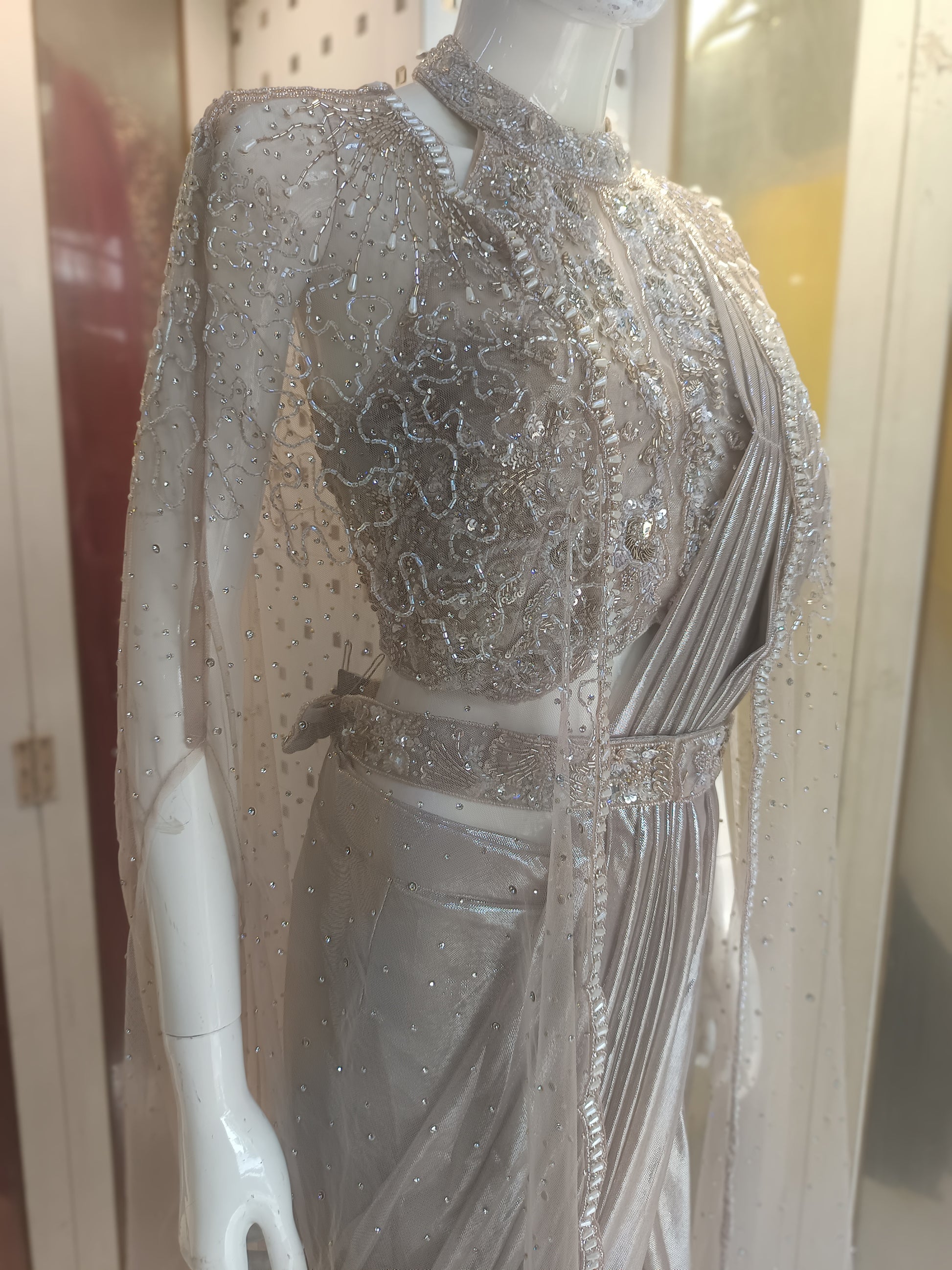 This ready-to-wear saree features elegant Maharani net fabric, perfectly complemented by intricate handwork on the blouse. Paired with a long jacket, it offers a sophisticated and contemporary silhouette, combining traditional craftsmanship with modern style for a refined look. Ideal for festive occasions and formal events, it ensures both comfort and grace.