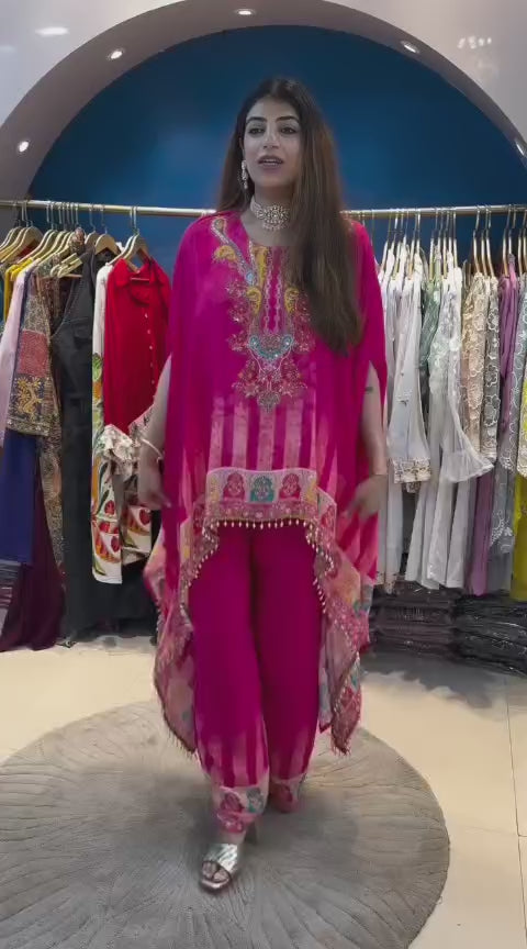 Experience effortless elegance with this short poncho kaftan paired with pants, crafted from pure crepe fabric featuring vibrant digital prints. The lightweight, breathable material ensures comfort while the stylish silhouette offers versatility for both casual and semi-formal occasions. Perfect for those seeking a refined yet relaxed look, this ensemble blends traditional charm with modern design.